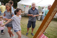 Mehr als 30 Kinder waren angemeldet. Da hatten die Organisatoren um Uschi Seiferth alle Hände voll zu tun. Das Team hatte sich erfreulicherweise vergrößert und somit lief alles wie am Schnürchen. Vielen Dank den Organisatorinnen und Betreürn der Spielstationen. Neben bewährten Spielen gab es wieder etwas Neüs – ein richtiges Angelbecken, das Klettballspiel, der Tastsinn wird geschärft. Gartenfreund Czipull gab dem „heißen Draht“ ein neüs Aussehen. Die Holzfigur, die über Parallelskiläufer und Marienkäferflitzer wacht, ist ein gestandenes Mannsbild, erfunden und gebaut von Udo Wegner. Die Freiwillige Feürwehr lud zu Rundfahrten ein und hatte eine „echte“ Löschaufgabe parat – toll! Zwei Pferde vom Pferdehof und ihre Begleiter mussten viel laufen. Nach gut zwei Stunden endete das Fest für die Kinder mit dem obligatorischen Bonbonregen, für die meisten Kinder scheinbar viel zu früh.Auch für die Erwachsenen hielt das Sommerfest einige kulinarische und musikalische Überraschungen bereit. Das Kuchenbuffet war schnell gestürmt. Die Grillparty daürte etwas länger. Und der DJ lief bis nach Mitternacht zur Hochform auf. Unter den Tänzern sollen auch noch viele Kinder gesichtet worden sein.